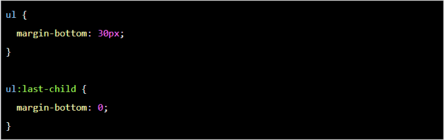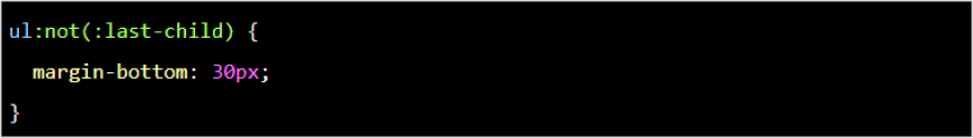 Чтобы не создавать два селектора, можно написать короче, используя псевдокласс :not. Тут мы буквально говорим следующее: «Задай отступ всем ul, но не последнему».